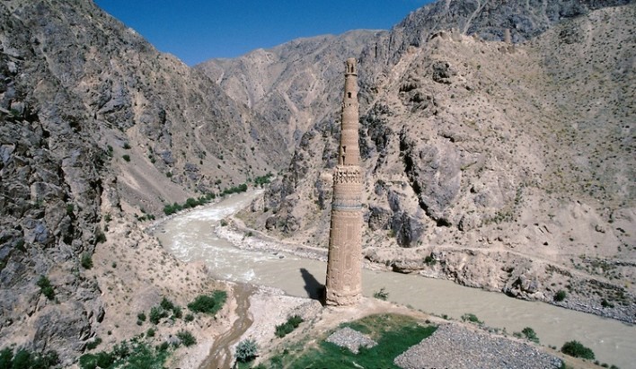 hoch aufragenden kargen Bergen, das 65 m hohe Minarett von Jam am Südufer des